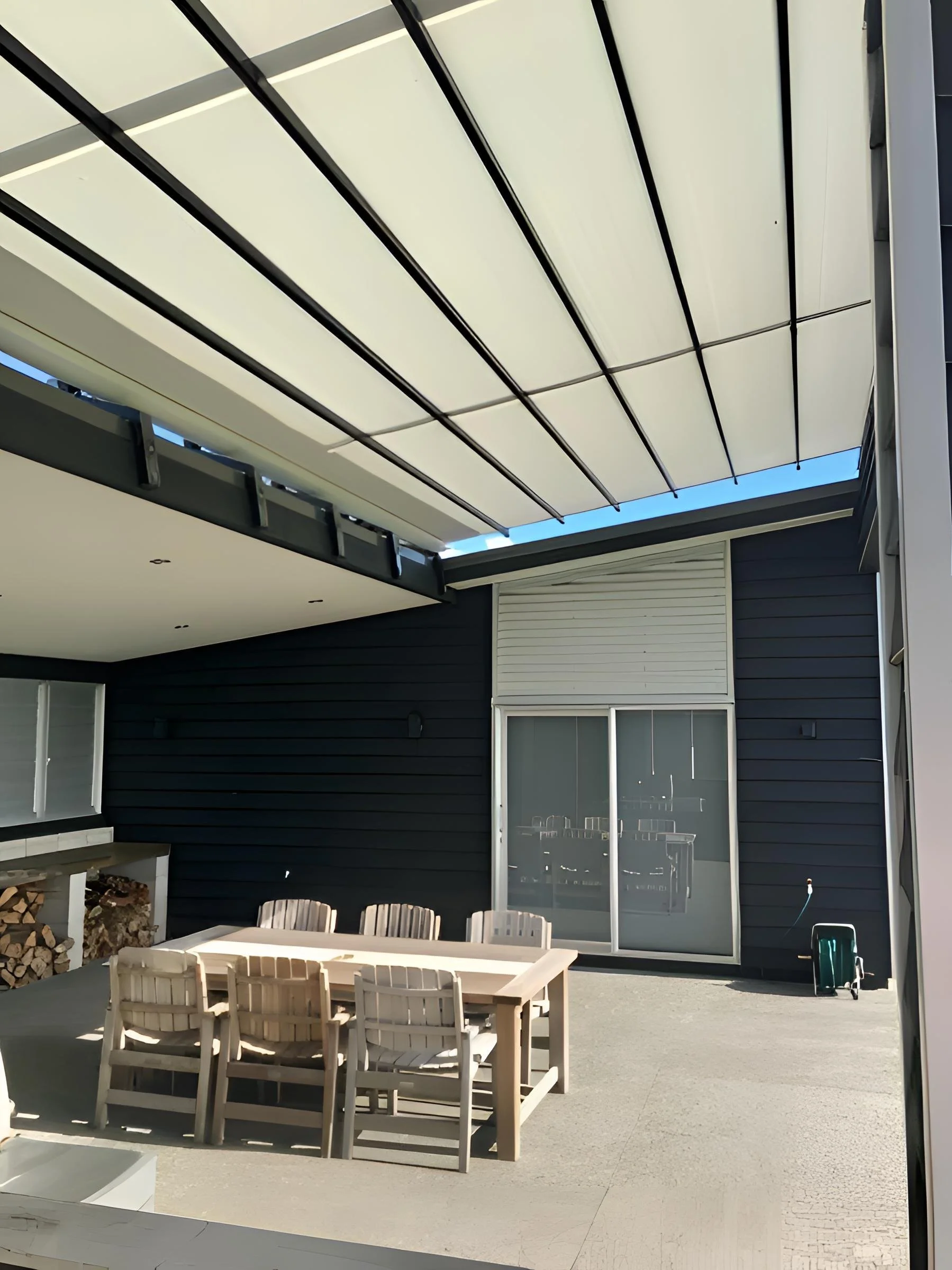 To manage rainwater, we installed a custom PVC spouting system with multiple downpipes, allowing for even dispersion over the roofline. A wind sensor was integrated into the system, programmed to retract the roof at a specified wind threshold, adhering to the engineering constraints.