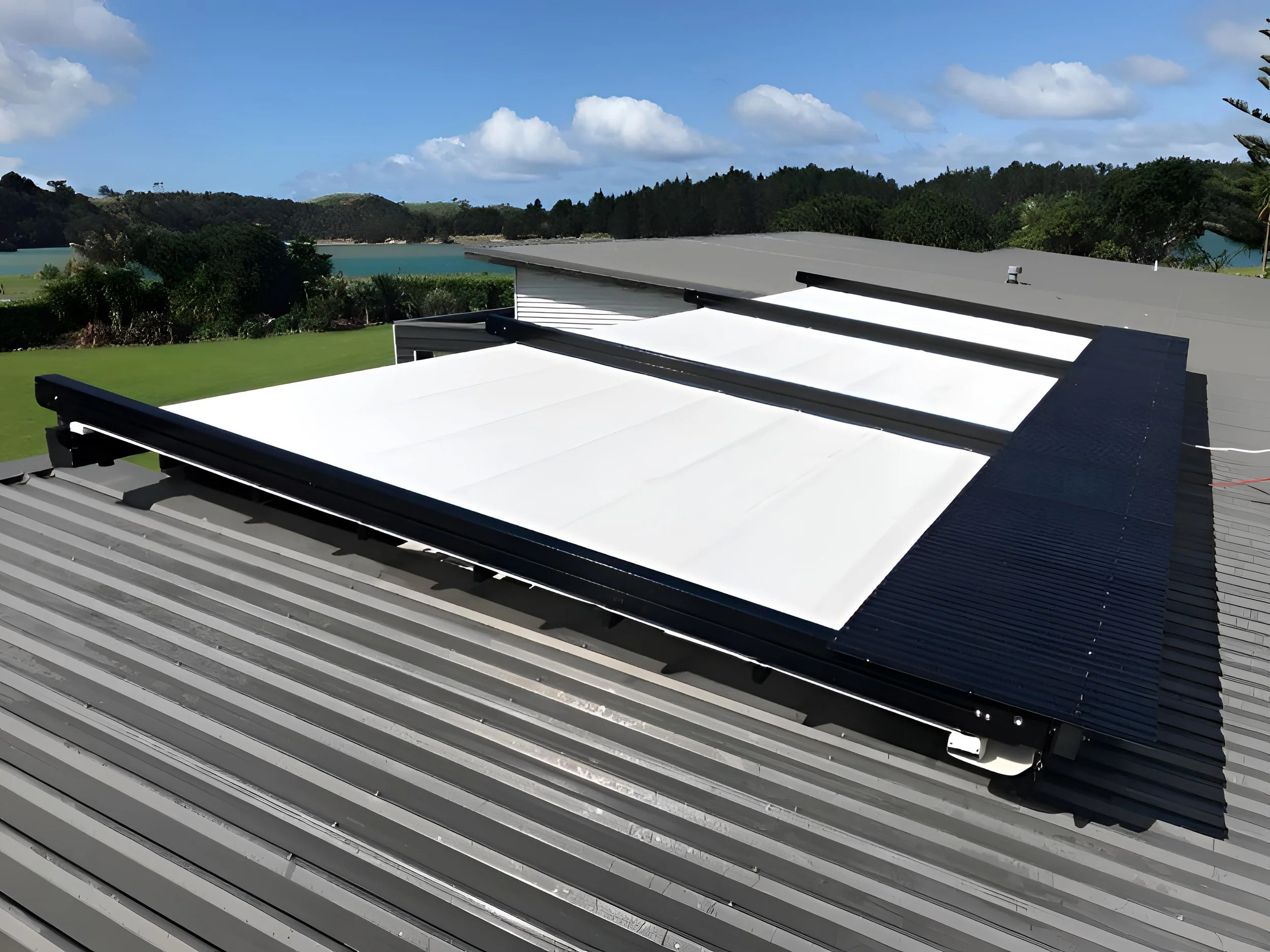 For this project, the client sought a highly specialized system to enhance their space while preserving the stunning ocean view. Their vision required a retractable, waterproof structure that could endure the high-wind zone conditions of the location. The design had to follow the contours of a reverse mono-pitch roofline, seamlessly attach to the building, and, most importantly, remain free from any support posts or framing that would obstruct the view.